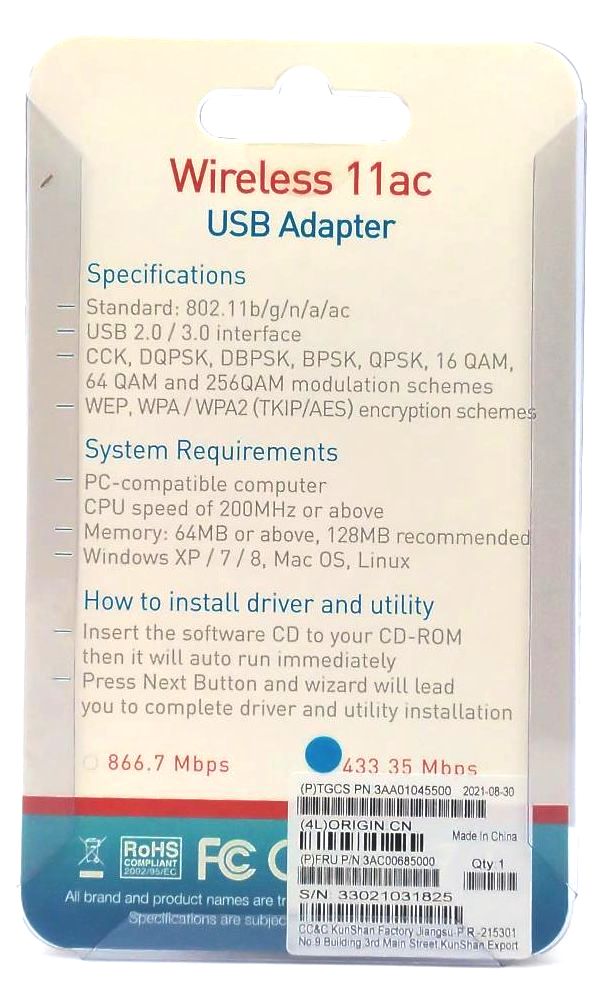 Toshiba USB 2.0 Bluetooth Adapter Wireless 11ac Dongle Receiver 3AA04181900
